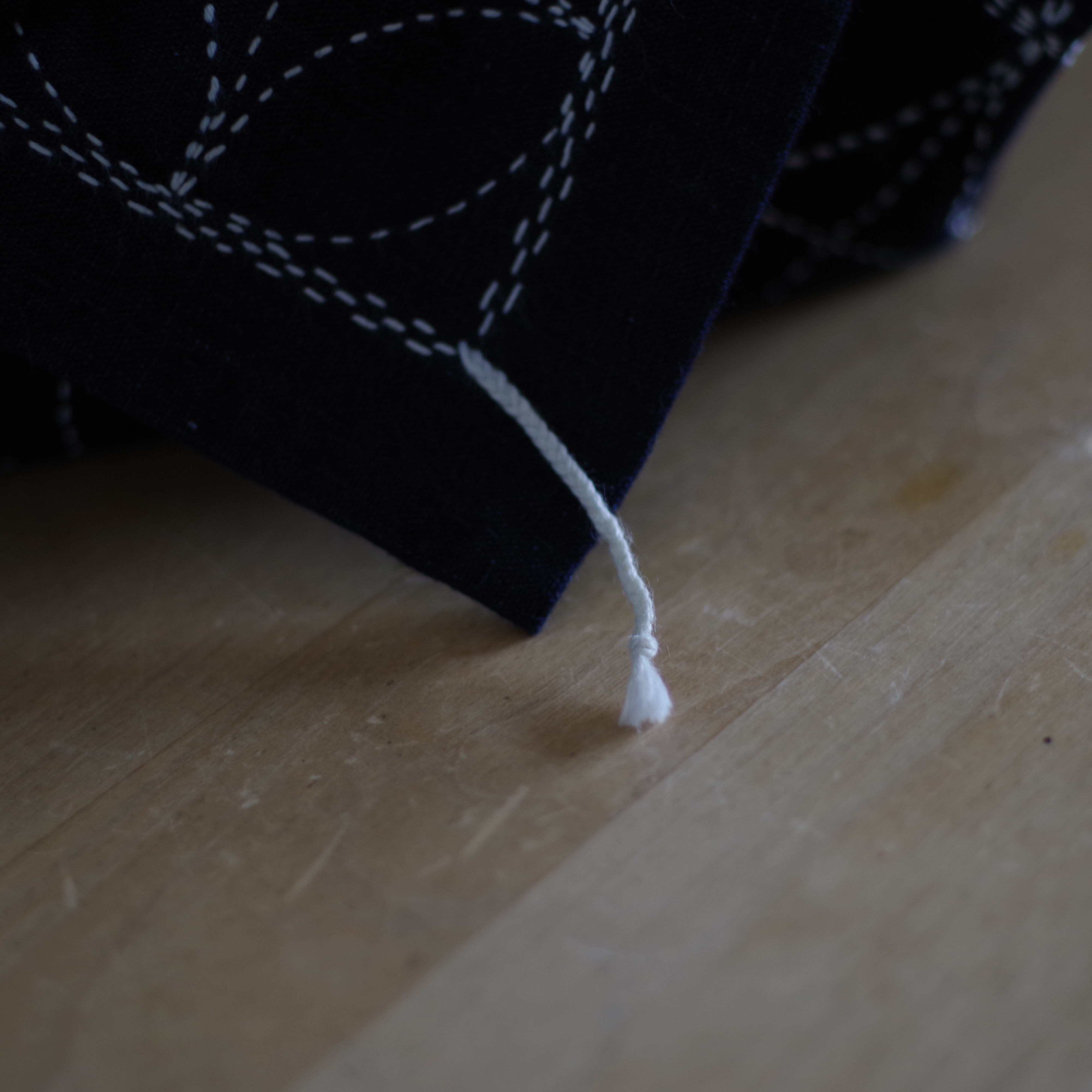 濃紺の藍染布に生成りの糸で直径8㎝の七宝模様を刺しています。