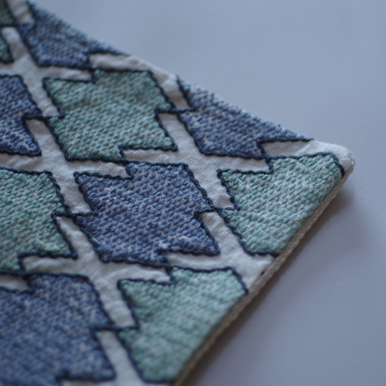 輪郭にチャコールグレー、菱の中はブルーグレーとミントグリーンの糸を使用しています。