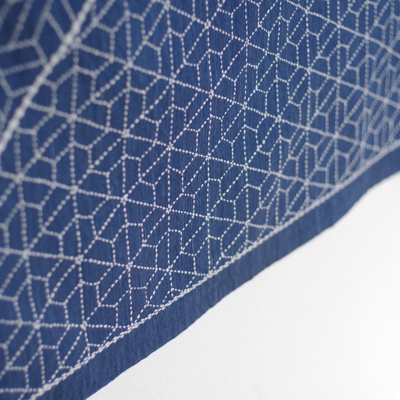 あさぎ色に縞の入った綿に、生成りの綿糸で刺し子をしています。