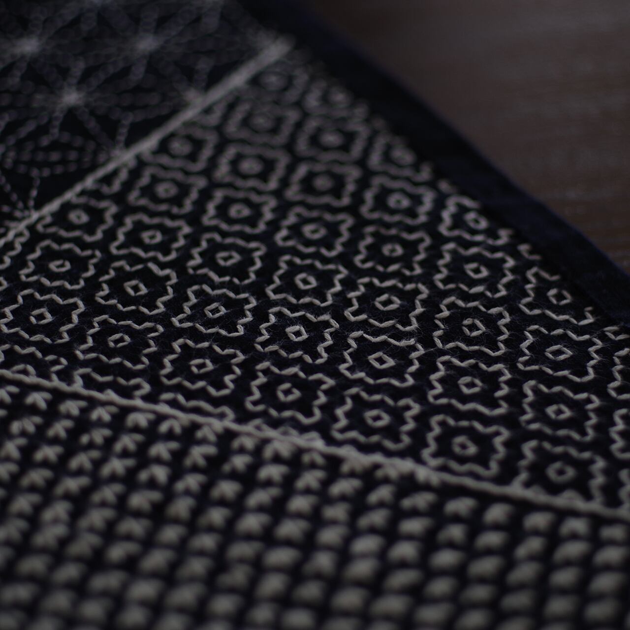 生成りの綿糸で刺し子をしています。模様は写真2枚目より上段が麻の葉、下段左から段つなぎ、市松、笹刺し、柿の花です。