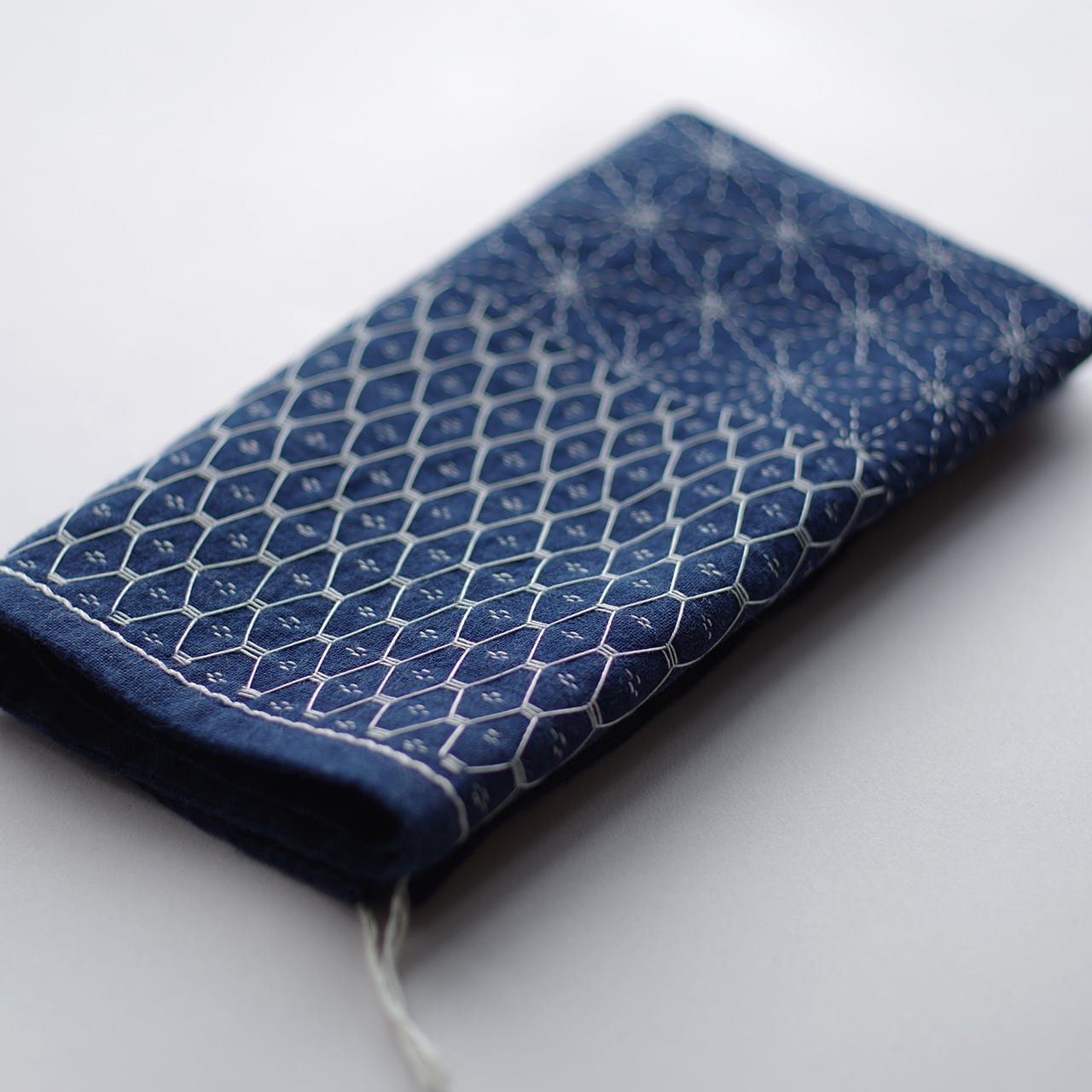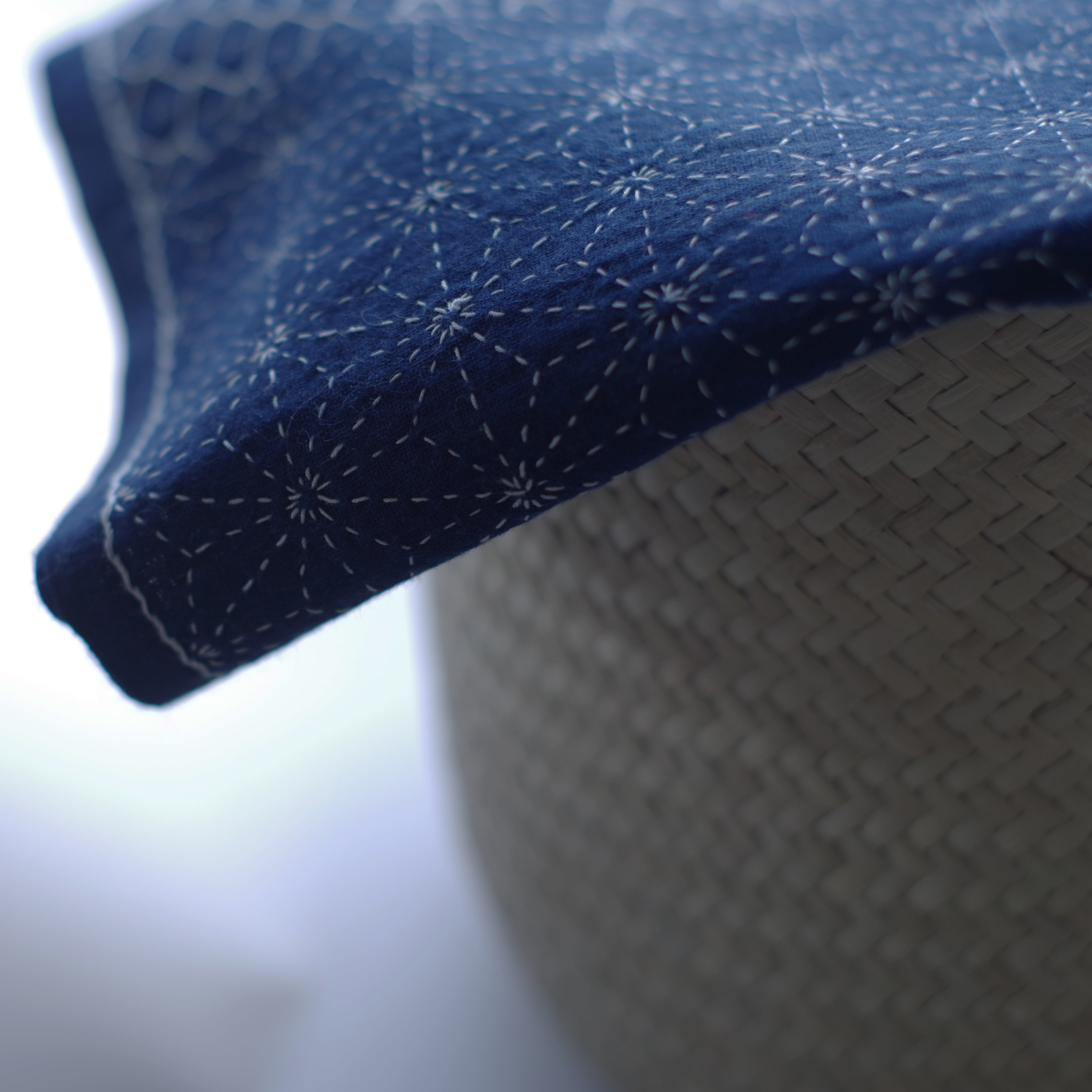 模様は上から祭り提灯、麻の葉、田水。祭り提灯と田水は糸通し刺しという技法で、地刺しをした後表の縫い目に糸を渡しています。生成りの手縫い糸を使用。(前回お出しした本藍染のふきんより細いです)裏は写真6枚目のようになっています。光の加減で明るく映っている写真が多く、実物の色は2、9、10枚目に近いです。